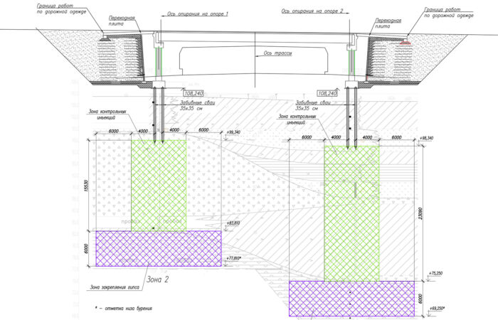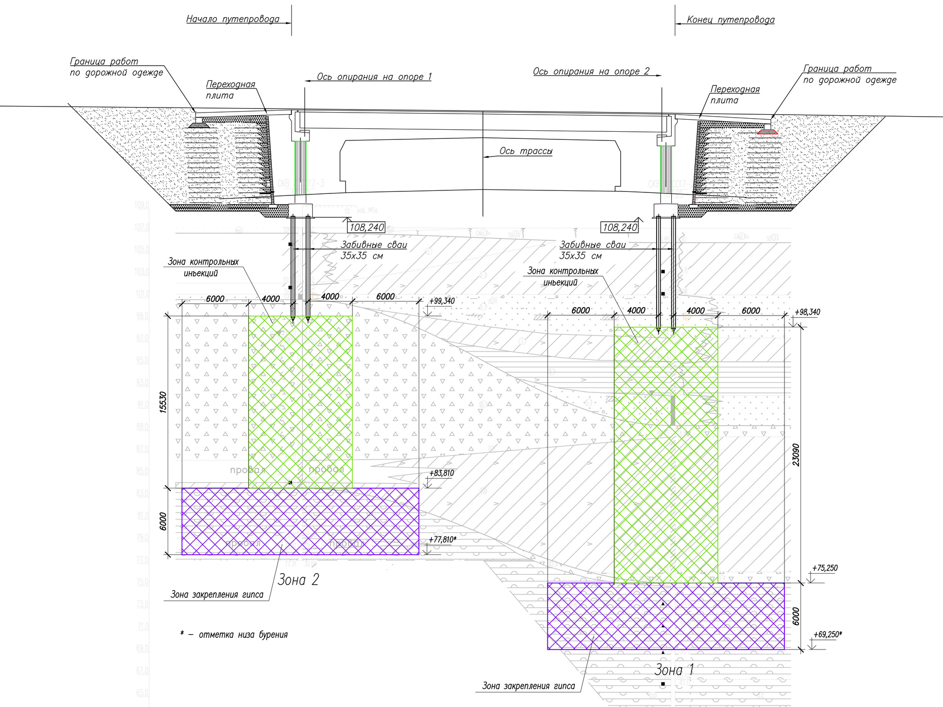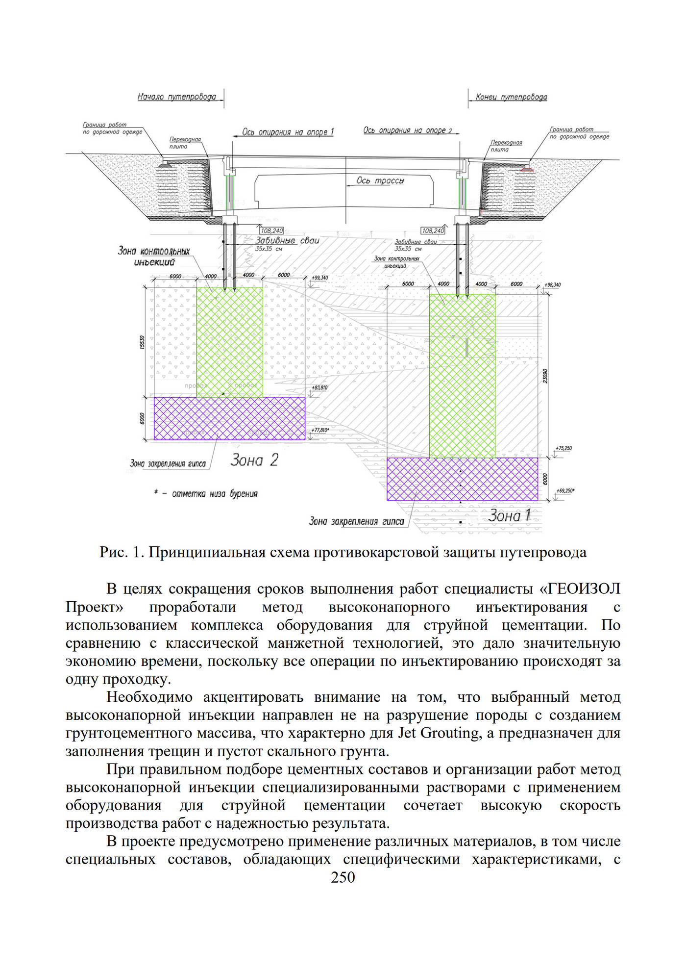 В итоге был принят вариант инъекционного закрепления (рис. 1), который предполагает исключение рисков развития карстовых процессов путем заполнения пустот, полостей, трещин и зон разрушения карстующихся пород и покрывающей толщи.