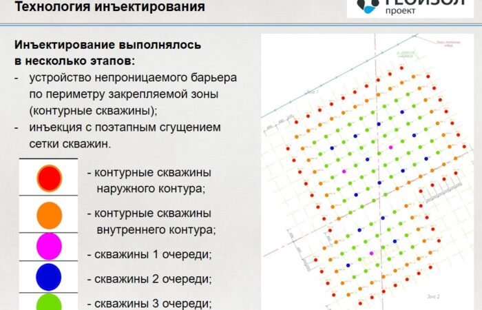 Размер зоны инъектирования грунта определяется для каждого сооружения индивидуально в зависимости от диаметра карстовой воронки. Работы по инъектированию выполняются в несколько этапов.