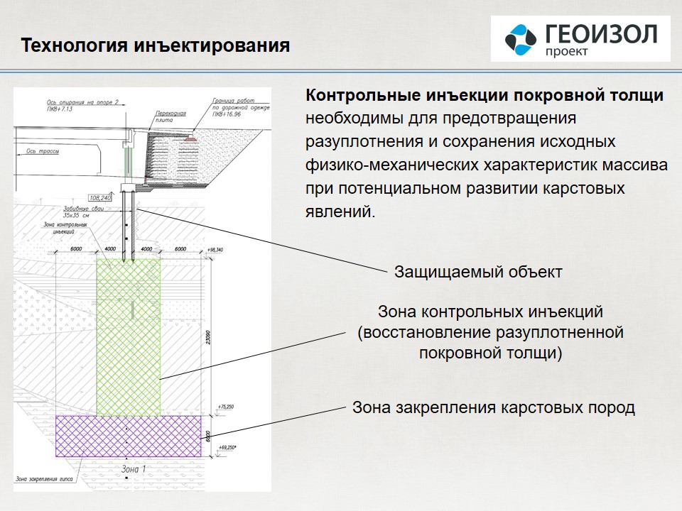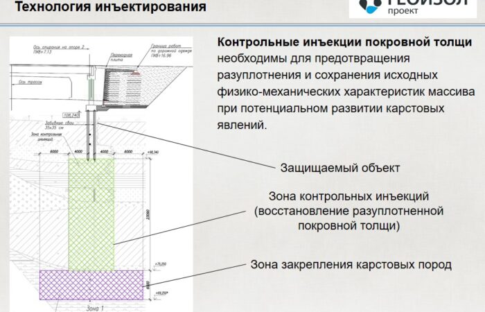 При наличии в верхней зоне над карстующимися породами крупнообломочных, песчаных и иных несвязных грунтов дополнительно предусматриваются контрольные инъекции покровной толщи для предотвращения разуплотнения и сохранения исходных физико-механических характеристик массива в случае развития карстово-суффозионных процессов вблизи защищаемого объекта.
