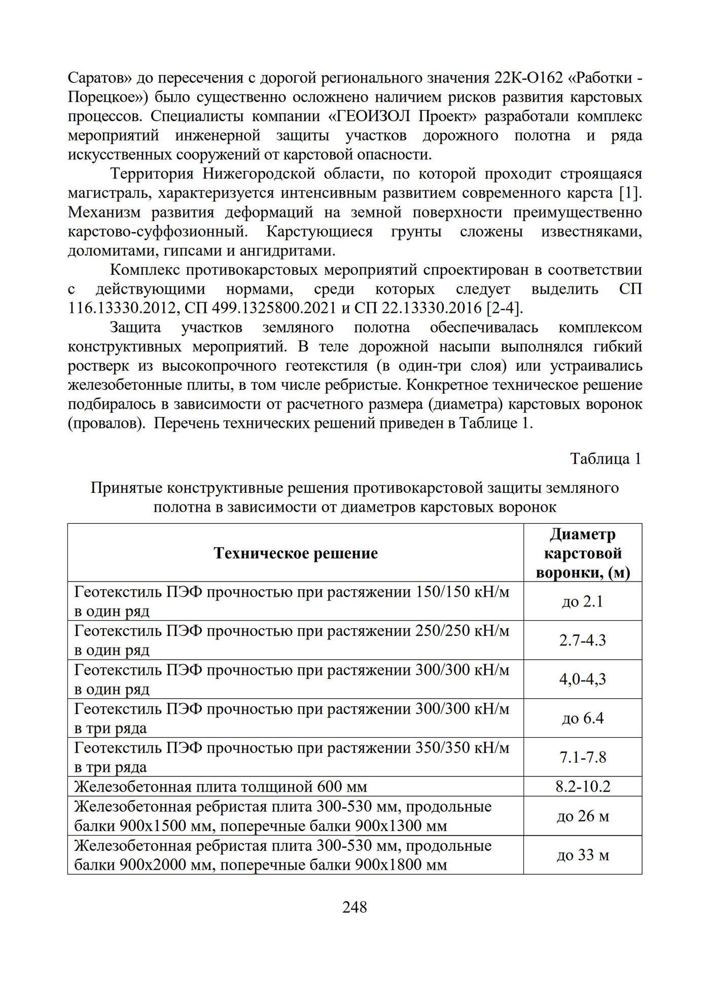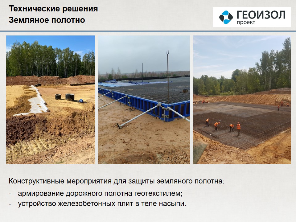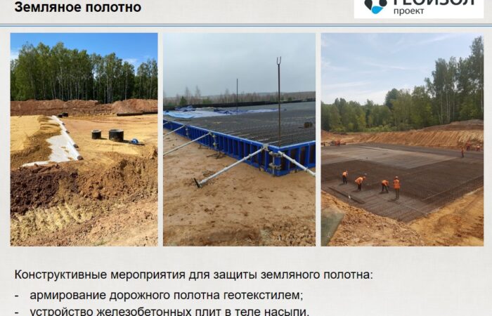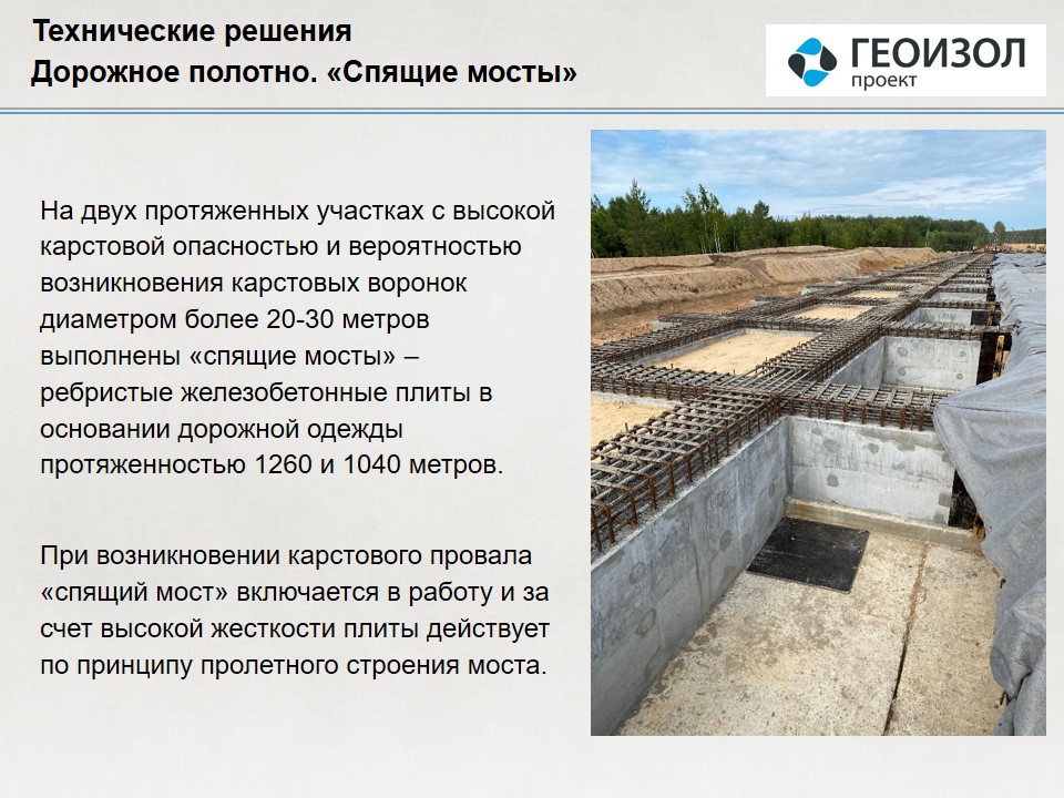 Защита участков земляного полотна обеспечивалась комплексом конструктивных мероприятий. В теле дорожной насыпи выполнялся гибкий ростверк из высокопрочного геотекстиля (в один-три слоя) или устраивались железобетонные плиты, в том числе ребристые. Конкретное техническое решение подбиралось в зависимости от расчетного размера (диаметра) карстовых воронок (провалов). Перечень технических решений приведен в Таблице 1.