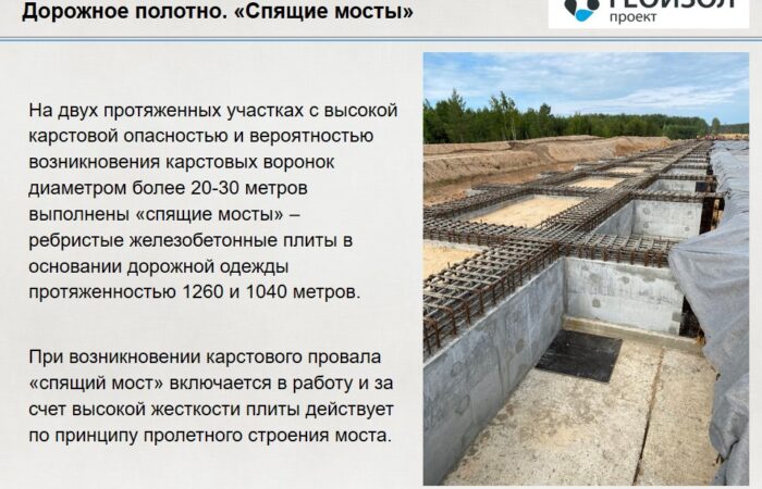 Для защиты протяженных участков дороги (более 1000 м) устроены «спящие мосты» – ребристые железобетонные плиты в основании дорожной конструкции