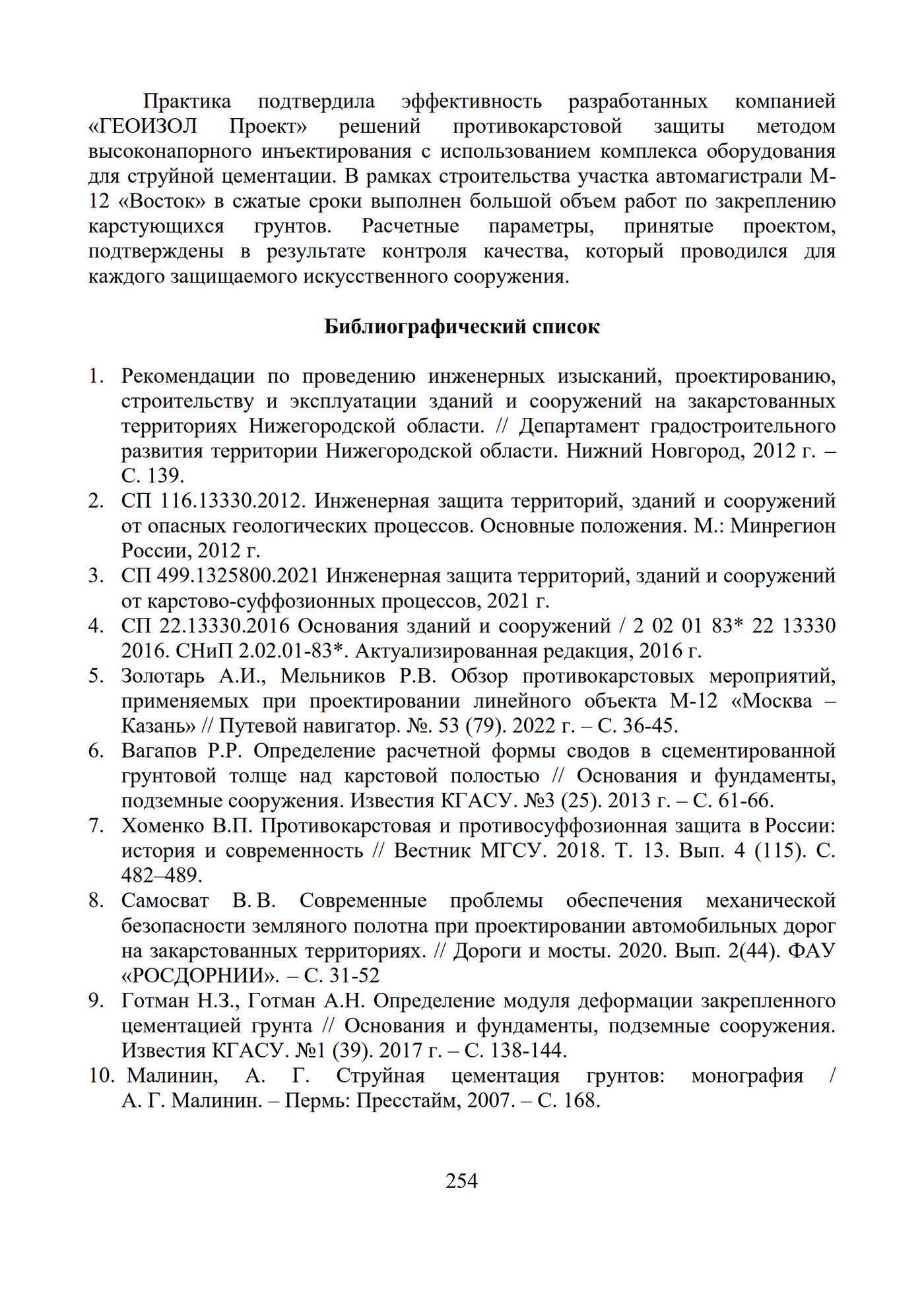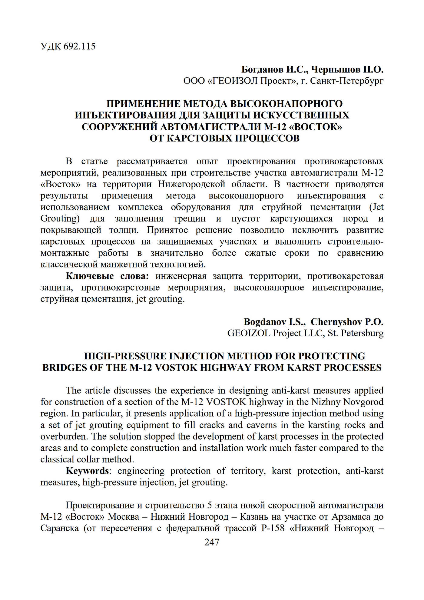 Богданов И.С., Чернышов П.О. Применение метода высоконапорного инъектирования для защиты искусственных сооружений автомагистрали М-12 «Восток» от карстовых процессов // Комплексные технологии в механике и транспортном строительстве: материалы II Всероссийской научно-практической конференции «Комплексные технологии в механике и транспортном строительстве», посвящённой памяти профессора Г.Н. Гаврилова (14 декабря 2023 г.) / под общей редакцией Веприняка И.А. – СПб, Петергоф: ВИ (ЖДВ и ВОСО), 2023. – 360 с.