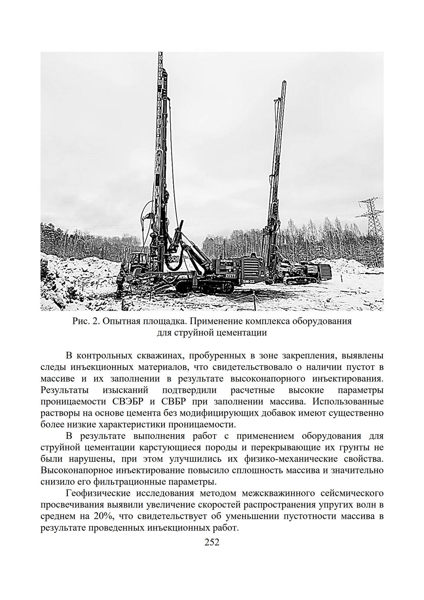 В результате выполнения работ с применением оборудования для струйной цементации карстующиеся породы и перекрывающие их грунты не были нарушены, при этом улучшились их физико-механические свойства. Высоконапорное инъектирование повысило сплошность массива и значительно снизило его фильтрационные параметры.